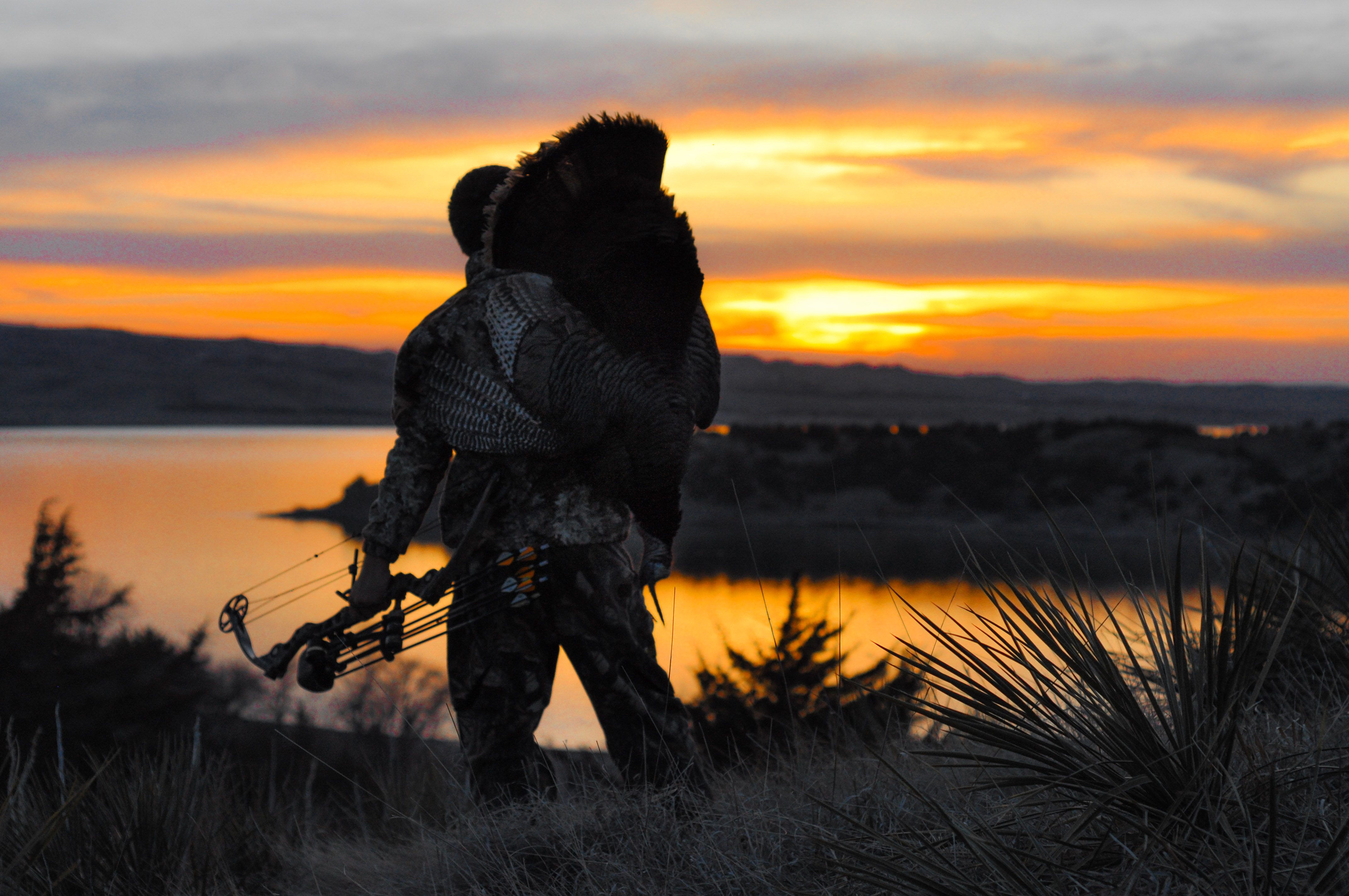 I was proved wrong, as he climbed the hill with a mountain goat like skill and proceeded to come into full strut on the top of the hill. I tried to coax the gobbler into a few more yards but he wouldn’t budge. I decided it wasn’t worth the risk of Mr. Tom getting cold feet, and drew back at 27 yards. The arrow buried into the wing bone and directly into the boilermaker. He rolled a few yards down the hill and came to a stop.